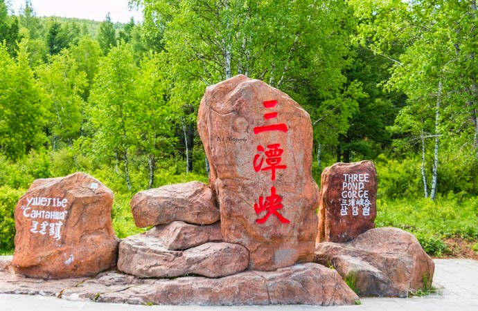 三潭峽位于阿爾山市東北78公里的哈拉哈河上游,阿爾山林業(yè)局天池林場境內(nèi),由映松潭、映壁潭、龍鳳潭三個(gè)深潭組成。峽谷長約3公里,河身由巨細(xì)不等于的片巖組成,湍急的哈拉哈河從河谷穿行,珠飛玉卷,火山熔巖布滿河床,水深處波平如鏡,難見其底,水淺處人可踏石涉水而過。峽谷南壁陡峭險(xiǎn)峻,北壁由巨大火山巖堆積而成。這一河段六月冰雪尚存,被稱為“夏季冰川”。