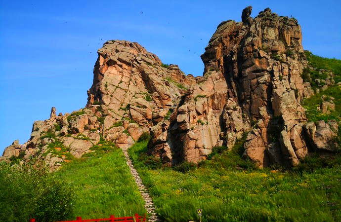 玫瑰峰位于阿爾山市西北約25公里處,是一處由十余座石峰組成的山石景區(qū),石峰錯(cuò)落有致,犬牙交錯(cuò),因石峰大部分呈紅褐色,因此得名“玫瑰峰”,也叫“紅石砬子”。從玫瑰峰的中間石階向上,左側(cè)山峰幾乎呈九十度直角,非常險(xiǎn)峻。站在玫瑰峰最高俯視四野,起伏連綿的山嶺承載著五彩繽紛的萬物,如浪濤翻滾的麥田象大海一樣遼闊,哈拉哈河宛如銀鏈繞峰而去。?